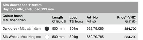 + Ray hộp Hafele Alto H199 552.79.085 có tải trọng tối đa: 30 kgs