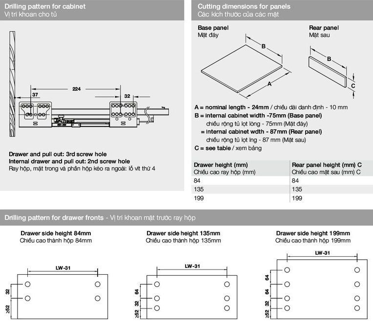 + Chiều cao ngăn kéo tối thiểu: 225mm