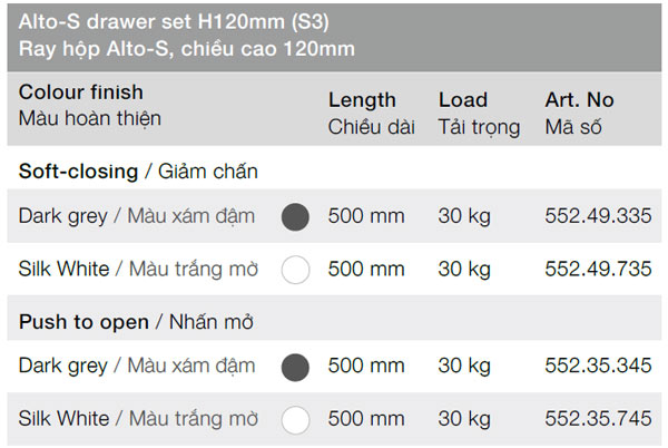 | Màu xám đậm | 500 mm | 30 kg | 552.49.335 | 786.500 |