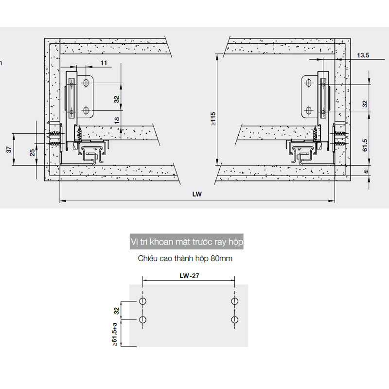 >> Chiều cao: Thành hộp có các sẵn các chiều cao H80, chiều cao thanh nâng cấp H=230 mm