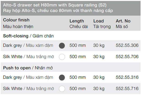 | Màu xám đậm | 500 mm | 30 kg | 552.55.316 | 869.000 |