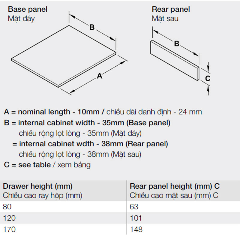 Loại: Ray hộp Hafele với thanh hộp mỏng