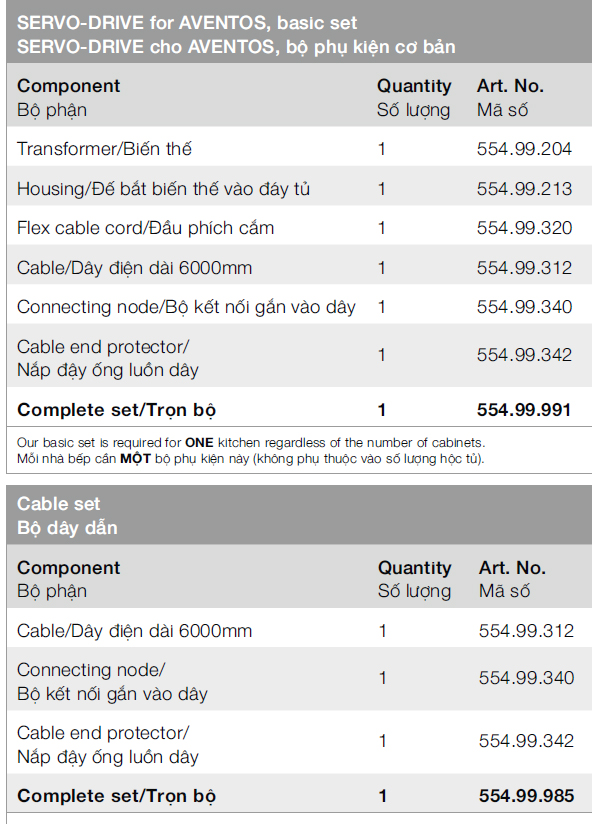 DANH SÁCH MÃ SỐ CỦA TAY NÂNG ĐIỆN BLUM AVENTOS HF