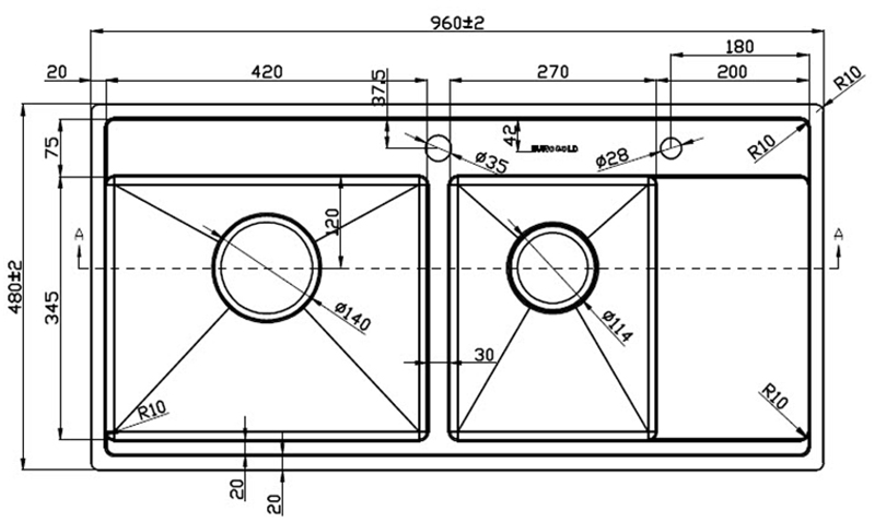 Chậu rửa bát có góc R10 tạo nên vẻ đẹp tinh tế.