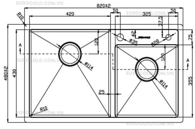 Chậu rủa bát có góc R10 tạo nên vẻ đẹp tinh tế.