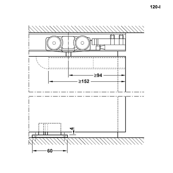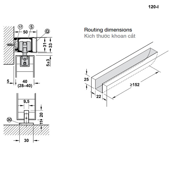 + Lắp đặt: Lắp đặt phụ kiện cửa trượt Hafele 120-I dạng treo âm