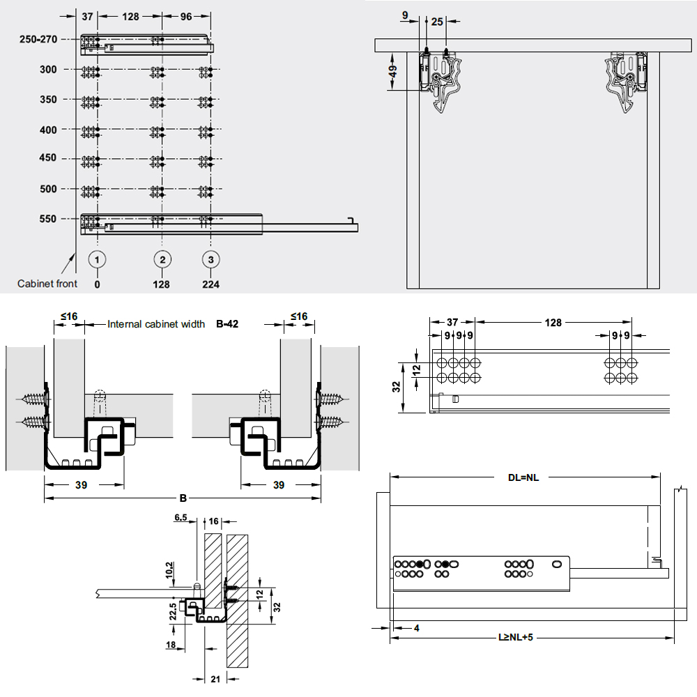 >> Các kích thước: Chiều rộng hộc tủ tối đa = chiều rộng tủ lọt lòng – 42 mm + 2x độ dày thành hộc T =16 mm