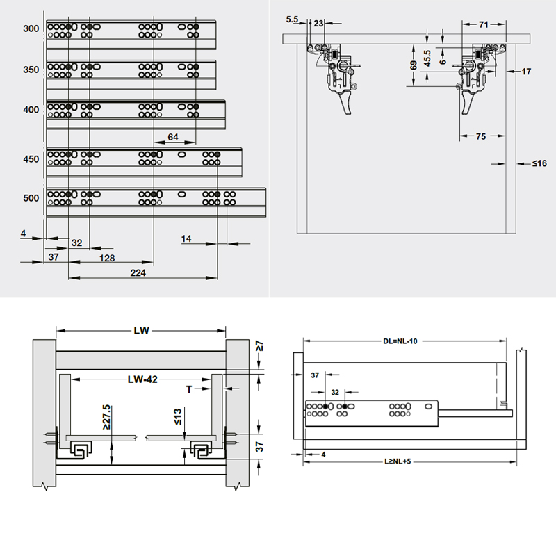 >> Các kích thước: Chiều rộng hộc tủ tối đa = chiều rộng tủ lọt lòng – 42 mm + 2x độ dày thành hộc T = 16mm