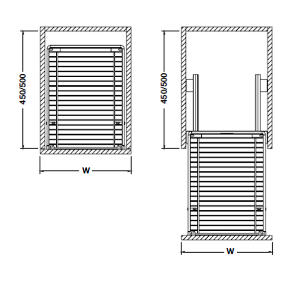 + Phiên bản của giá xoong nồi hafele 549.03.141 ray trượt và rổ gắn mặt cánh trước
