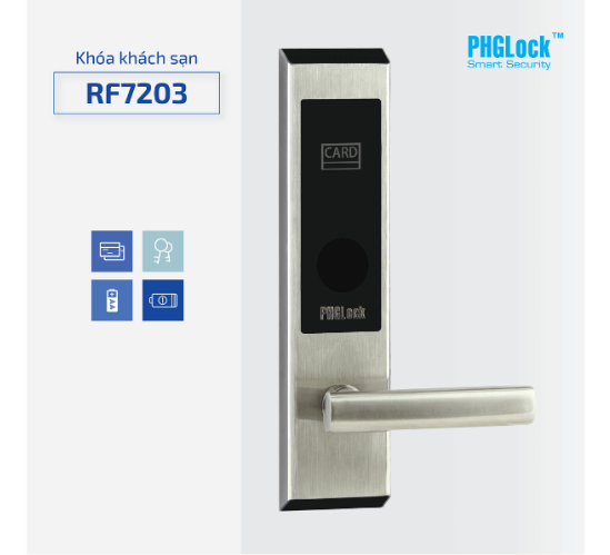 PHGLOCK RF7203 là dòng khóa cửa thông minh cho khách sạn bán chạy, giá rẻ trên thị trường hiện nay. RF7203 là dòng khoá khách sạn chuyên dụng, dễ dàng quản lý và tiết kiệm thời gian là ưu điểm của dòng khoá này. Chính vì điều đó nó rất phù hợp cho sự ra vào thường xuyên của du khách.
