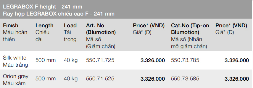 + Ray hộp Blum Legrabox 550.73.585 có tải trọng tối đa: 40 kgs