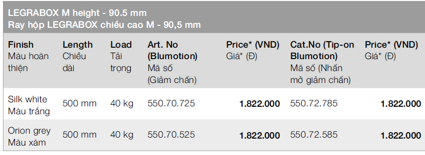 + Ray hộp Blum Legrabox có tải trọng tối đa: 40 kgs