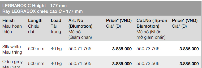 Tên: Ray Legrabox ngăn kéo chiều cao C 177mm màu trắng-xám