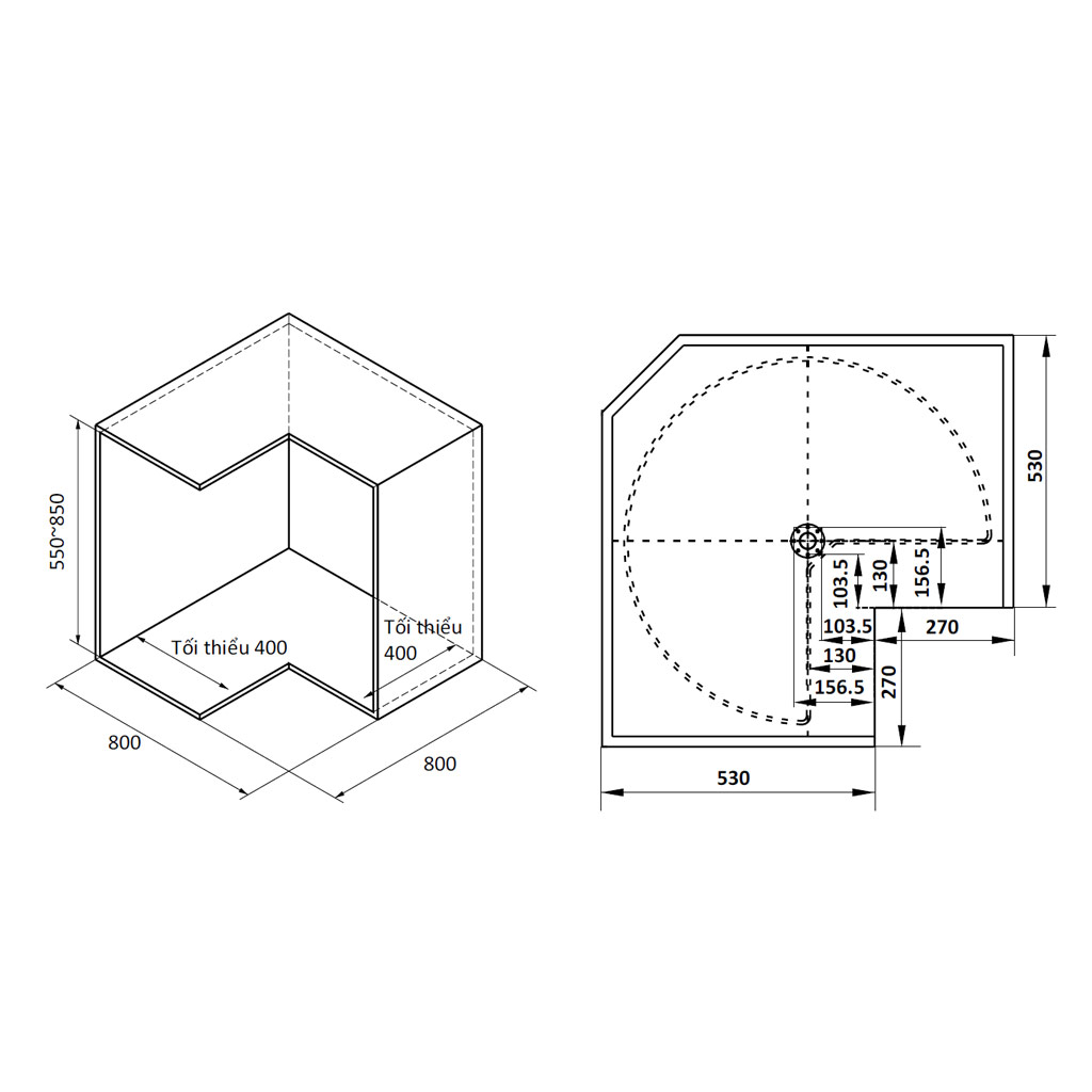 + Kích thước khoang tủ mâm xoay cucina Hafele 3/4: Min W=800mm