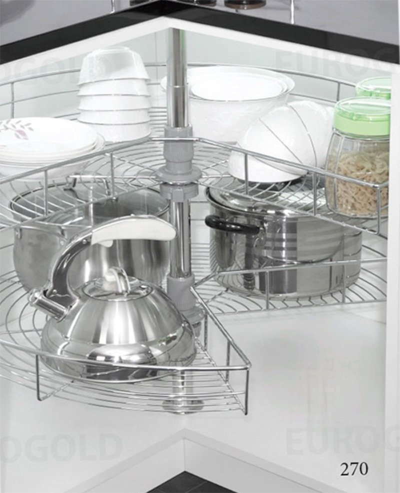 Mâm xoay Eurogold EP270A xoay 270 độ có chức năng giúp các gia đình tiết kiệm không gian ở phần tủ góc, khi mở mâm xoay sẽ toàn bộ kệ sẽ được xoay ra ngoài, giúp người sử dụng lấy đồ dễ dàng, đặc biệt cũng dễ dàng sắp xếp và dễ dàng vệ sinh.