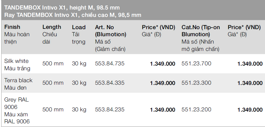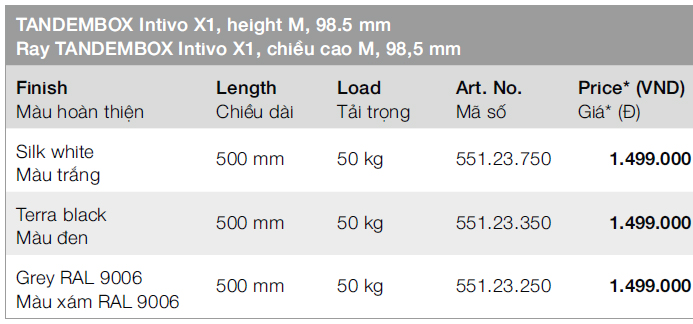+ Chiều dài ray hộp blum tandembox X1: 500mm