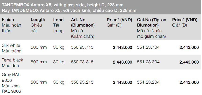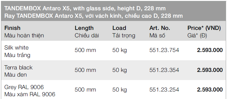 + Chiều dài ray hộp blum tandembox X5: 500mm