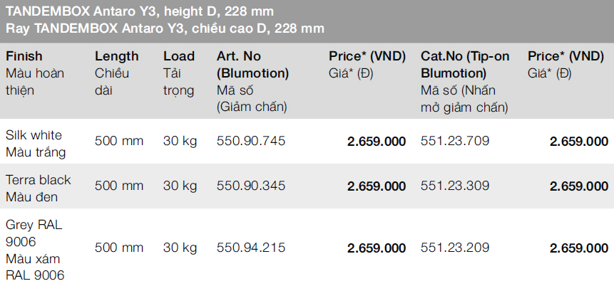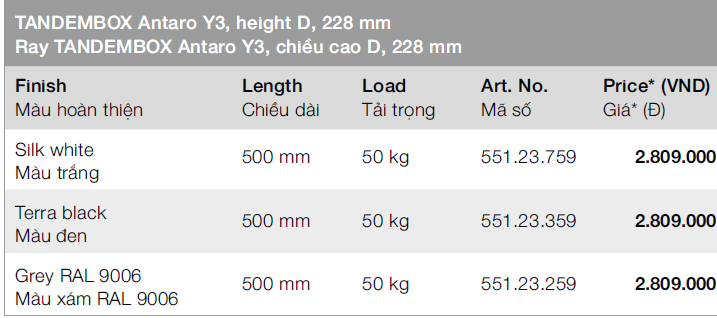 + Chiều dài ray blum tandembox Y3: 500mm