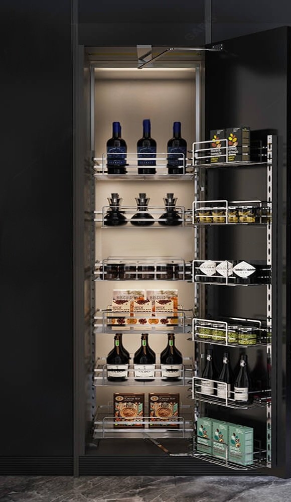 Thiết kế dạng nan góp phần tạo cảm giác nhẹ nhàng, thanh thoát cho tủ kho. Ngoài ra với thiết kế 6 tầng, 12 rổ đựng thì được thiết kế thu gọn trong khoang tủ góp phần tăng tính thẩm mĩ, tạo sự gọn gàng cho căn bếp nhà bạn.