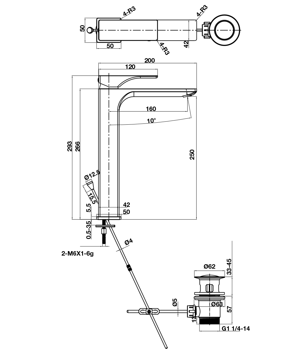 - Khoảng cách từ đầu vòi đến mặt bàn : 250mm